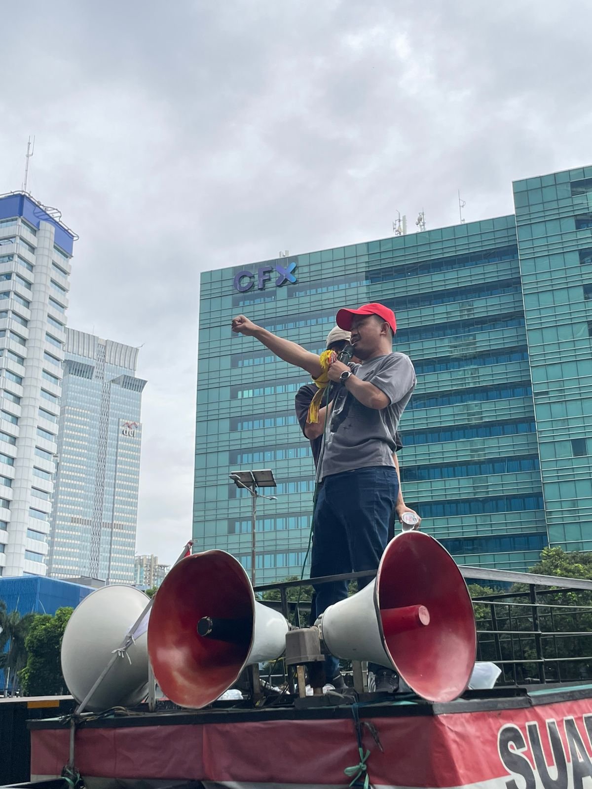 Dari atas mobil komando, pokok-pokok seruan perlawanan disuarakan oleh Aliansi Perjuangan Keadilan Rakyat Tanimbar.