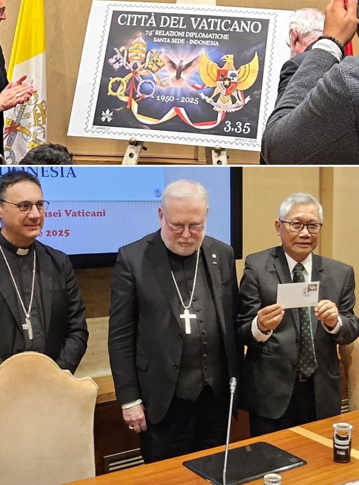 Pada Jumat (14/11/2025), di Museum Vatikan, Secretary for Relations with States and International Organizations (Menlu), Mgr Paul Richard Gallagher dan Secretary General of the Governorate of Vatican City State, Mgr Emilio Nappa bersama Duta Besar RI untuk Takhta Suci, Michael Trias Kuncahyono, secara resmi meluncurkan perangko edisi khusus peringatan 75 tahun hubungan diplomatik kedua negara.