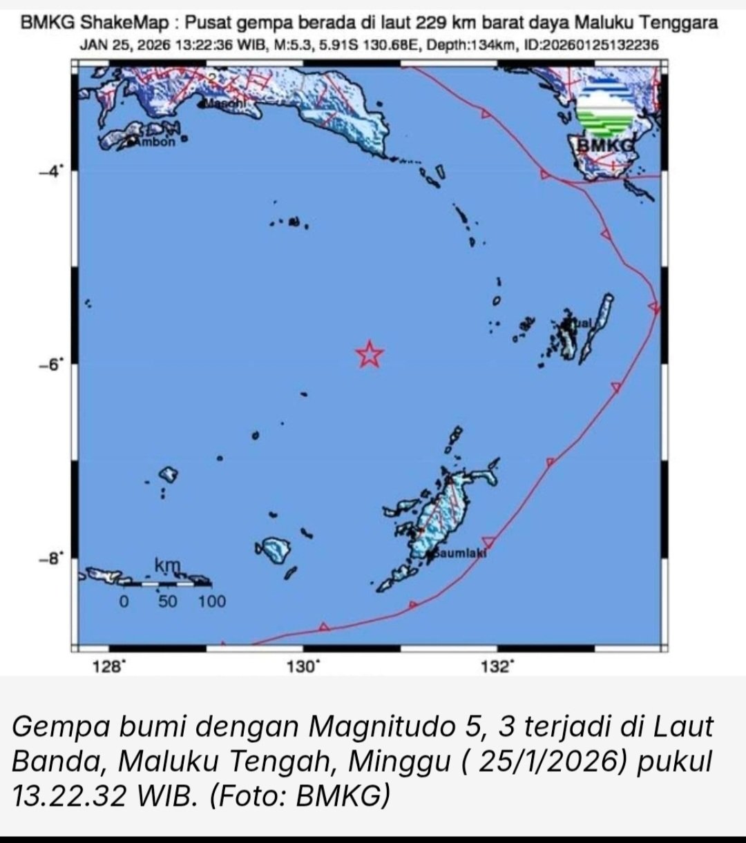 Ambon,Fordatanews.com._ Gempa bumi dengan Magnitudo 5, 3 Skala Richer (SR) terjadi di Laut Banda, Maluku Tengah, Minggu (25/1/2026) pukul 13.22.32 WIB. Episentrum gempa bumi terletak pada koordinat 6,23° LS ; 130,69° BT.