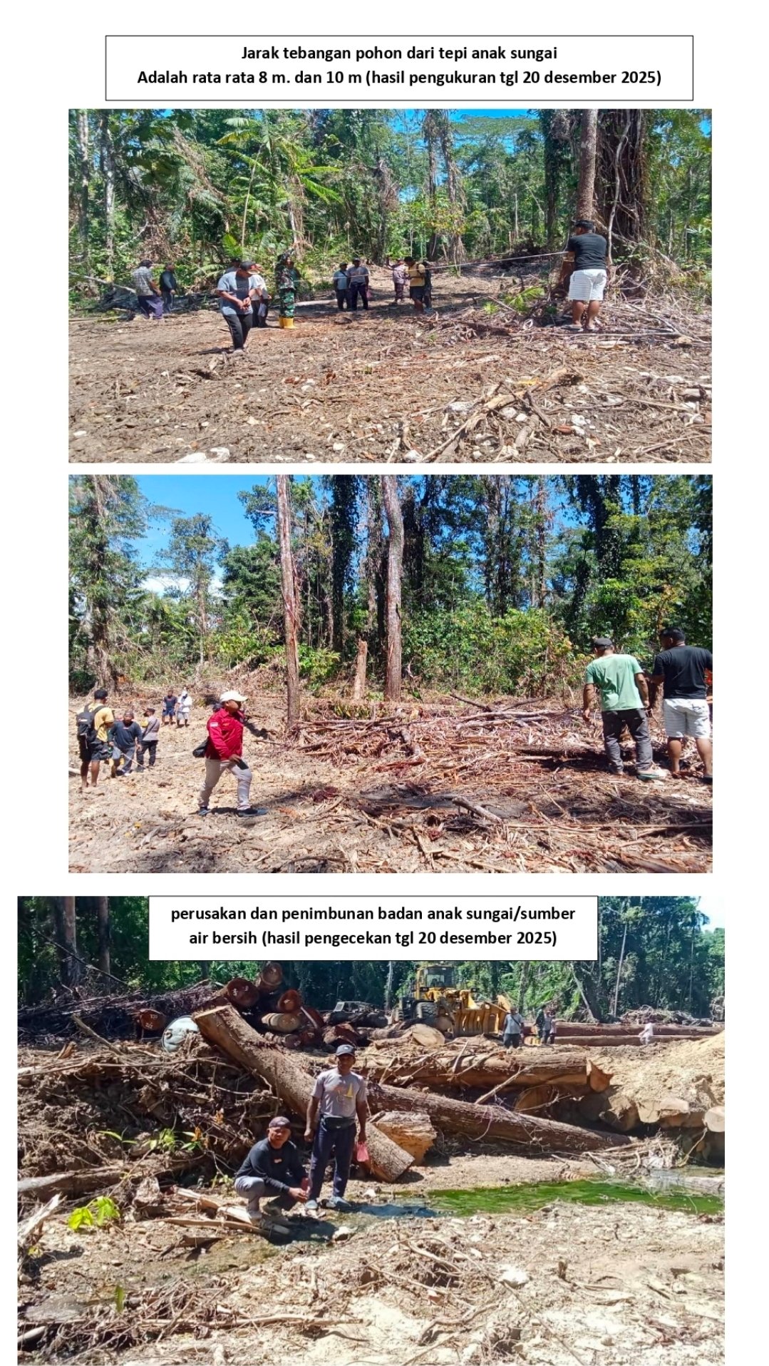 Serta menutup badan anak sungai dengan timbunan tanah serta batang batang pohon untuk di jadikan lokasi penimbunan kayu kayu gelondongan (logs).